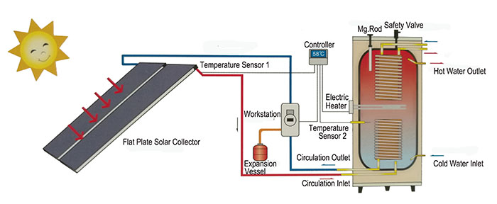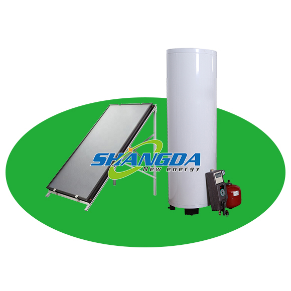water tank, flat plate solar collector, solar work station,expansion vessel and intelligent controller etc.