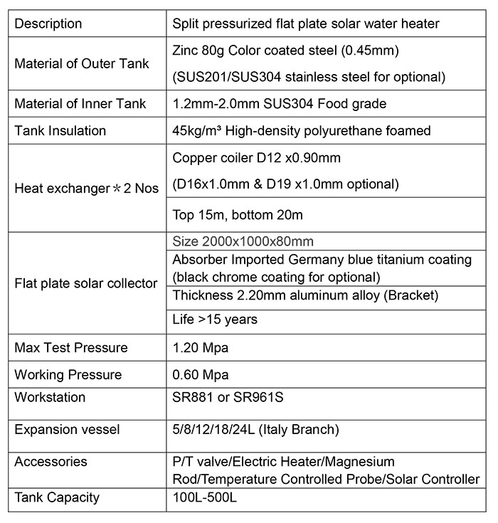 ● Split pressurized flat plate solar water heater is an active system, is composed of pressurized